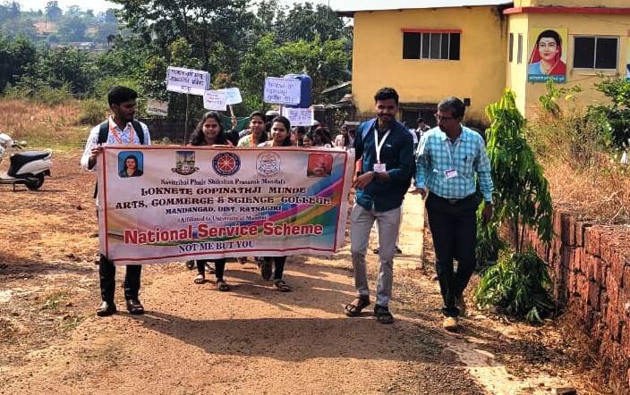 मंडणगड (प्रतिनिधी) : येथील सावित्रीबाई फुले शिक्षण प्रसारक मंडळाच्या लोकनेते गोपीनाथजी मुंडे कला,वाणिज्य व विज्ञान महाविद्यालयाच्या राष्ट्रीय सेवा योजना विभाग व आजीवन शिक्षण व विस्तार विभागच्या वतीने संयुक्त विद्यमाने ‘जागतिक एड्स’ दिनानिमित्त नुकतेच मंडणगड शहरात जनजागृती फेरीचे आयोजन करण्यात आले होते. मंडणगड परिसरात काढलेल्या या फेरीदरम्यान विद्यार्थ्यांनी एड्स जाणा – एड्स टाळा , मै जवान हूं – नादान नही, ये है मेरा वादा आज के दिन, एड्स की जानकारी खुशहाल जिंदगी की सवारी, घरोघरी एकच नारा, एड्सला नाही थारा, करु एड्स निर्मूलन, उपाय एकच प्रतिबंधन अशा प्रकारच्या घोषणा देवून या भयंकर आजारापासून मुक्त रहाण्याबाबत विद्यार्थी व ग्रामस्थांमध्ये जनजागृती केली.