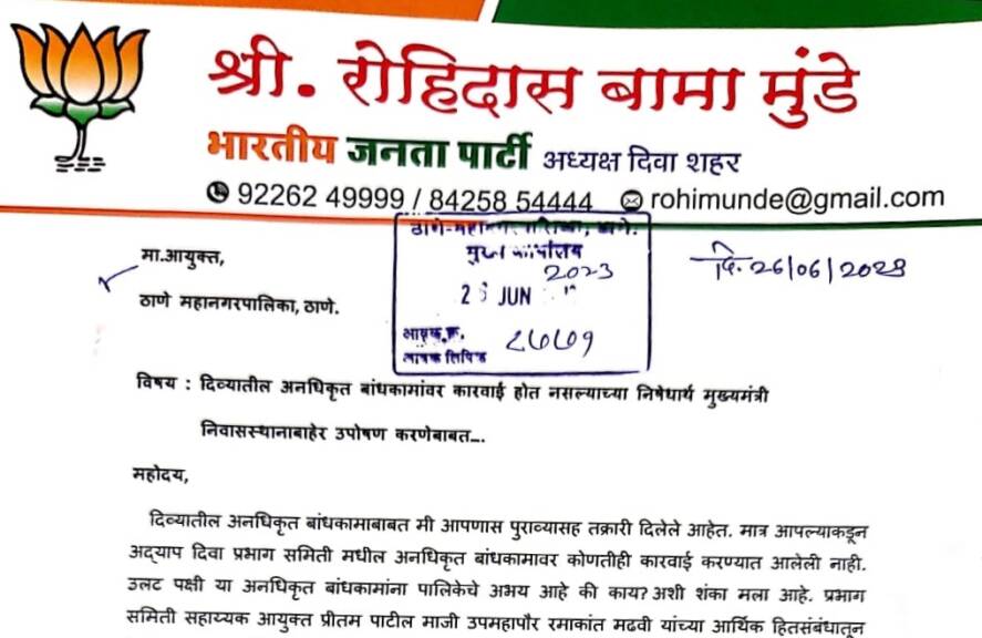ठाणे : (कार्य.स.निलेश घाग) दिव्यातील अनधिकृत बांधकामांवर कारवाई होत नसल्याच्या निषेधार्थ मुख्यमंत्री निवासस्थानाबाहेर उपोषण करण्याचा निर्वाणीचा इशारा दिवा शहर भाजपचे मंडळ अध्यक्ष रोहिदास मुंडे यांनी पालिका आयुक्तांना पत्राद्वारे दिला आहे.