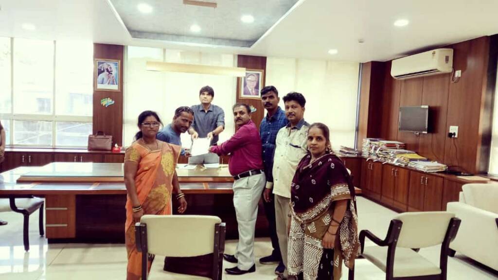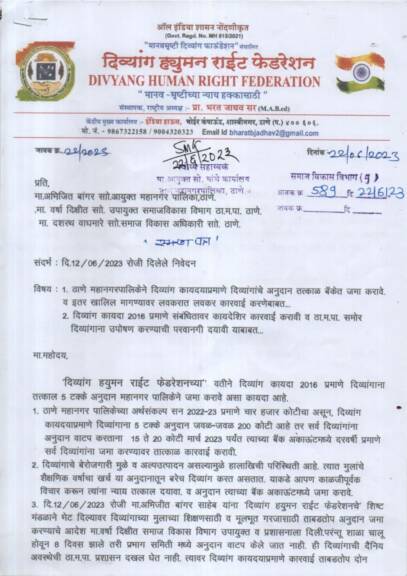 ठाणे : ठाणे महानगरपालिका आयुक्त माननीय अभिजीत बांगर साहेब व दीक्षित मॅडम उपायुक्त समाज विकास विभाग यांना दिनांक12 /6/ 2013 निवेदन देऊन दिव्यांगांना मुलांच्या शिक्षणासाठी 2023 मार्चचे अनुदान दिव्यांग कायद्यानुसार लवकर जमा करावे याबाबत प्रत्येक्ष भेटून व चर्चा करुन निवेदन दिले त्यावेळेस मा. बांगर साहेबांनीआठवडाभरात जमा होईल असे आश्वासन दिले.परंतु आठ दहा दिवस होऊन सुद्धाअनुदान जमा झाले नाही…. म्हणून दिव्यांग हयुमन राईट फेडरेशन तर्फे महिला विभाग पदाधिकारी व तसेच सर्व दिव्यांग पदाधिकारी ,समाजसेवक,व सर्व ठाण्याचे दिव्यांग,तसेच राष्ट्रीय अध्यक्ष संस्थापक: प्राध्यापक भरत जाधव सर यांच्या नेतृत्वाखाली व मार्गदर्शनाखाली ठाणे महानगरपालिकांच्या याअन्याया विरुद्ध महानगरपालिकेवर सर्वपदाधिकाऱ्यांनी एकत्र येऊन मा. दीक्षित मॅडम वमा.बांगर साहेब यांना भेटून संबंधितअधिकाऱ्यांवर दिव्यांग कायद्याप्रमाणे कायदेशीर कारवाई करावी व तसेच सर्व ठाण्याच्या दिव्यांगांना संस्थांना दिव्यांग ह्युमन राईट फेडरेशनला बेमुदत उपोषण करण्याची मागणी करण्यात आली.