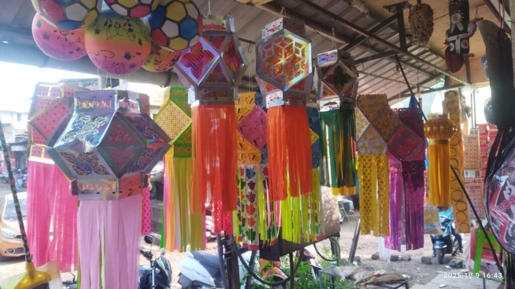 संगमेश्वर : दिनेश अंब्रे- सध्या दिवाळी पर्वाला सुरुवात होत असून संगमेश्वर येथील बाजारपेठेमध्ये दीपावली निमित्त विविध प्रकारचे रंगीबेरंगी आकाश कंदील, आकर्षक दीपमाळा सध्या दुकानात विक्रीस ठेवल्या आहेत.