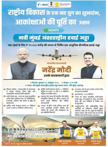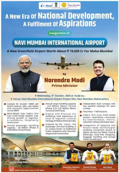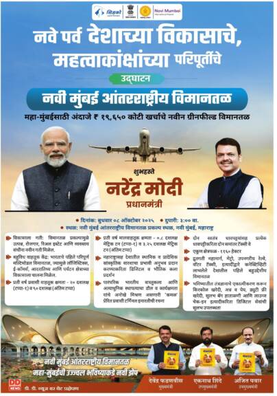 गेल्या अनेक वर्षांपासून बहुप्रतीक्षित असलेल्या नवी मुंबई विमानतळ व मेट्रो-३ चे स्वप्न अखेर साकार होणार आहे. पंतप्रधान नरेंद्र मोदी यांच्या हस्ते बुधवारी दुपारी नवी मुंबई आंतरराष्ट्रीय विमानतळाच्या पहिल्या टप्प्याचे उद्घाटन करण्यात येणार आहे.अखेर नवी मुंबई विमानतळाचे स्वप्न आज साकार…