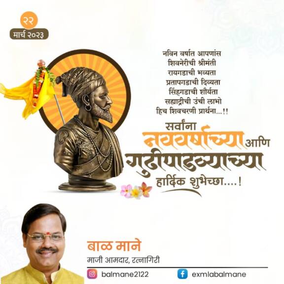 रत्नागिरी : साडेतीन शुभमुहूर्तांपैकी एक असणार्या गुढीपाडव्याच्या आणि हिंदू नववर्षाच्या सर्व बांधवांना रत्नागिरी विधानसभेचे माजी आमदार बाळासाहेब माने यांनी शुभेच्छा दिल्या आहेत. यावेळी आपल्या भावना व्यक्त करताना ते म्हणाले, “नवीन वर्षात आपणास शिवनेरीची श्रीमंती, रायगडाची भव्यता, प्रतापगडाची दिव्यता, सिंहगडाची शौर्यता, सह्याद्रीची उंची लाभो हिच शिवचरणी प्रार्थना..!! सर्वांना नववर्षाच्या नववर्षाच्या आणि गुढीपाडव्याच्या हार्दिक शुभेच्छा….!” यावेळी त्यांनी आपल्या शुभेच्छापर संदेशात छत्रपती शिवाजी महाराजांचा अर्धपुतळा असलेला फोटो समाविष्ट करून शिववंदन केले आहे.