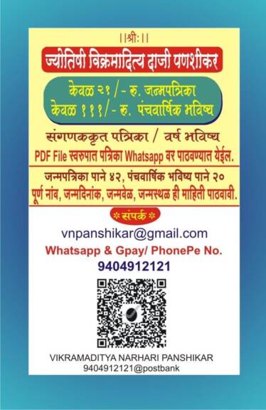 ज्योतिष विषयाचे अभ्यासक विक्रमादित्य पणशीकर यांनी हा अभिनव उपक्रम सुरु केला आहे. जन्म दिनांक, जन्म वेळ आणि जन्मस्थळ ही माहिती What’s app no – 9404912121 वर पाठवावी. जन्मपत्रिका केवळ 21/- रुपयात तयार करुन देण्यात येईल असे पणशीकर यांनी सांगितले आहे. Gpay no- 9404912121