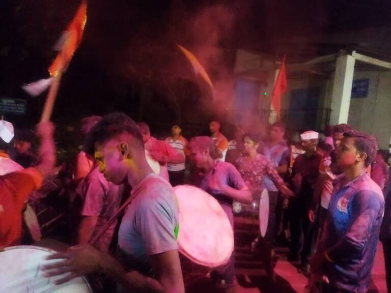 या सोहळ्यात आबालवृद्धांनी मोठ्या संख्येने सहभागी होऊन एकमेकांना गुलालाचा रंग लावला आणि आनंदाने धुलीवंदन साजरे केले. जाखमातेच्या नावानं चांगभलं असा जयघोष आणि पारंपरिक वाद्यांच्या नादात संगमेश्वरची बाजारपेठ गुलालमय झाली होती.