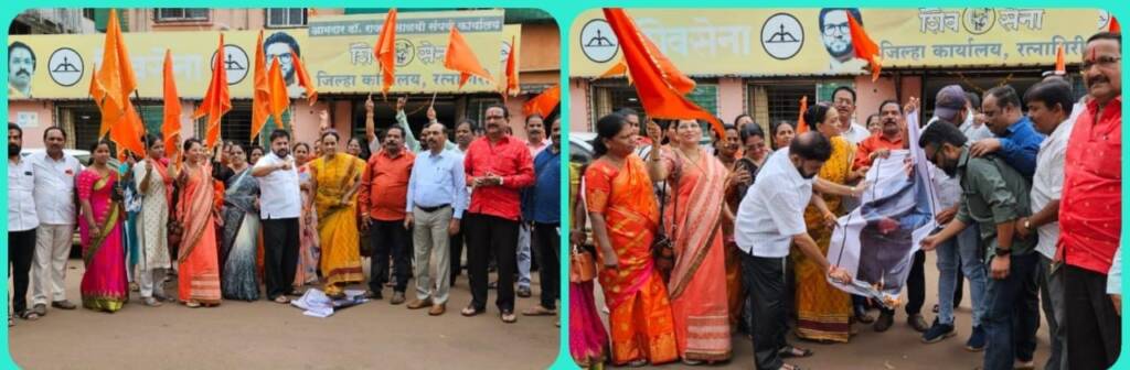 रत्नागिरी : शिवसेना (उध्दव बाळासाहेब ठाकरे) रत्नागिरी तालुक्याच्या वतीने किरीट सोमय्या यांचा आक्षेपार्ह व्हिडीओ च्या निषेधार्थ जोडे मारो आंदोलन करण्यात आले.* भाजप नेते किरीट सोमय्या यांचा आक्षेपार्ह व्हिडीओ वायरल झाल्याने सर्व सामान्य जनतेत आक्रोश पाहायला मिळत आहे. नैतिकतेच्या गप्पा मारणाऱ्या भाजपच्या नेत्यांनी किरीट सोमय्या यांची पक्षातून हकालपट्टी करून त्यांच्यावर कायदेशीर कारवाई करण्याची मागणी सर्वत्र होत आहे. बेंबीच्या देठापासून बेटी बचाओ, बेटी पढाओ म्हणणाऱ्या भाजपच्या नेत्यांच्या अशा कृत्यामुळं बेटी को भाजपा से बचाओ असं दुर्दैवानं म्हणण्याची वेळ आली आहे. त्याबद्दल आज शिवसेनेचे पदाधिकारी, महिला आघाडी अंगीकृत संघटनेचे सर्व आजी माजी पदाधिकारी व शिवसैनिक यांनी रत्नागिरी आठवडा बाजार येथे शिवसेना जिल्हा कार्यालय येथे जोडो मारो आंदोलन केले आहे. त्याप्रसंगी जिल्हाप्रमुख विलास चाळके, विधानसभा क्षेत्रप्रमुख प्रमोद शेरे, उप जिल्हाप्रमुख संजय साळवी, समनव्यक संजय पूनसकर, तालुकाप्रमुख प्रदीप उर्फ बंड्याशेठ साळवी, आबा घोसाळे, राकेश साळवी, शेखर घोसाळे, महेंद्र झापडेकर, अभय खेडेकर, प्रसाद सावंत, श्वेता फाळके, संध्या कोसुंबकर, दीपा जाधव, रशिदा गोदड, पूजा जाधव, साक्षी रावणाग, मनीषा बामणे, रंजना ढेपसे, राजश्री शिवलकर, बावा चव्हाण, महेश पत्की, किरण तोडणकर, संदीप सुर्वे व शिवसैनिक उपस्थित होते.