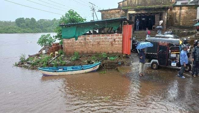 खेड :- शहरासह तालुक्यातील ग्रामीण भागात मुसळधार पाऊस कोसळत असून, जगबुडी नदीने सुमारे ७ मीटर ही धोक्याची पातळी गाठली आहे. शहरानजीक वाहणाऱ्या या नदीला पूर आल्याने किनाऱ्यावरील बंदर रोड पाण्याखाली गेला आहे. पुराचे पाणी पालिकेच्या मटण-मच्छी मार्केट येथून बाजारपेठेत शिरण्यास सुरुवात झाल्याने नागरीक धास्तावले आहेत. अतिवृष्टी सुरूच असल्याने प्रशासन पूरपरिस्थिती उद्भवल्यास सामोरे जाण्यासाठी सतर्क झाले आहे.
