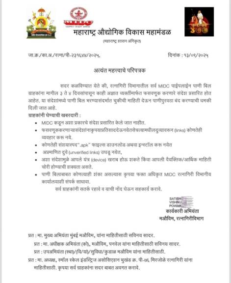 रत्नागिरी विभागातील सर्व MIDC पाईपलाईन पाणी बिल ग्राहकांना मागील ३ ते ४ दिवसांपासून काही अज्ञात व्यक्तींमार्फत फसवणूक करणारे संदेश प्रसारित होत आहेत. या संदेशांमध्ये पाणी बिल भरण्यासंदर्भात चुकीची माहिती देऊन पाणीपुरवठा बंद करण्याची धमकी दिली जात आहे.