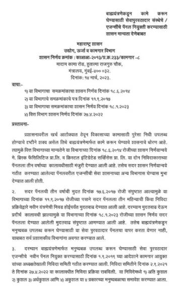 त्यानुसार, कामगार विभागाने निविदा समितीमार्फत राबवलेल्या निविदा प्रक्रियेनुसार पात्र ठरवलेल्या पुरवठादारांपैकी मंत्रीमंडळाने मान्यता दिलेल्या पात्र ९ पुरवठादारांच्या पॅनलला मनुष्यबळाच्या वर्गवारीनुसार व शासनाच्या अटी व शर्तींच्या अधीन राहून राज्यामध्ये बाह्ययंत्रणेमार्फत मनुष्यबळ पुरवठा करण्यासाठी शासनाची मान्यता देण्यात आली आहे.