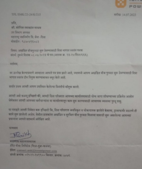 संदर्भ: दि.०८.०७.२०२३ चे पत्र (आवक क्र. २३-२४/शिल /६६६) POWER वर उल्लेख केल्याप्रमाणे आम्हाला आपले पत्र प्राप्त झाले आहे, ज्यामध्ये आपण अखंडित वीज पुरवठा सुरू ठेवण्यासाठी दिवा भागात स्वतंत्र टीम नियुक्त करण्याबाबत नमूद केले आहे. दि: १४.०७.२०२३ सर्वात प्रथम आम्ही आपण उपस्थित केलेल्या विनंतीचे कौतुक करतो.आम्ही असे कळवू इच्छितो की, आम्ही दिवा परिसरात आमच्या कार्यालयासाठी योग्य जागा शोधण्याच्या प्रक्रियेत आहोत जेणेकरुन आम्ही आमच्या कर्मचाऱ्यांना या कार्यालयातून काम सुरू करण्यासाठी आवश्यक व्यवस्था पुरवू या पत्राद्वारे आम्ही निवेदन करू इच्छितो कि, दिवा परिसरात अनधिकृत व धोकादायक झालेले केबल्स, ट्रान्सफार्मर बदलणे ही कामे सुरू झालेली आहेत. येथील ग्राहकांना अखंडित व सुरक्षित वीज पुरवठा मिळावा असा सकारात्मक प्रतिसाद पत्राद्वारे कळविण्यात आला आहे
