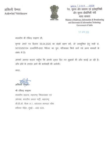 *रत्नागिरी-* कोकण रेल्वे मार्गावरील प्रवाशांची जीवनवाहिनी मानल्या जाणाऱ्या रत्नागिरी-दिवा पॅसेंजरचा दादरपर्यंतचा प्रवास पुन्हा सुरू होण्याच्या हालचालींना वेग आला आहे. गेल्या चार वर्षांपासून प्रलंबित असलेल्या या मागणीसाठी भाजपा प्रदेशाध्यक्ष रवींद्र चव्हाण यांनी केंद्रीय रेल्वेमंत्री अश्विनी वैष्णव यांची भेट घेऊन आग्रही मागणी केली होती. यावर रेल्वेमंत्र्यांनी सकारात्मक प्रतिसाद देत, गाडी दादरपर्यंत नेण्यासाठी तांत्रिक शक्यता तपासून त्यावर त्वरित कार्यवाही करण्याचे लेखी आश्वासन दिले आहे. यामुळे कोकणच्या चाकरमान्यांचा कडाक्याच्या संघर्षाला आता यशाची किनार लाभताना दिसत आहे.
