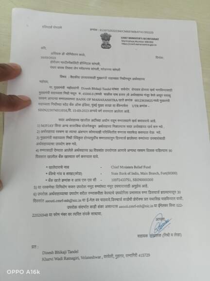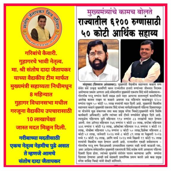 गुहागर तालुक्यातील प्रसिद्ध समाजसेवक, भारतीय जनता पक्ष उत्तर रत्नागिरी ओबीसी सेलचे जिल्हाध्यक्ष श्री. संतोष जैतापकर यांच्या वैद्यकीय टीमने वेळणेश्वर येथील श्री. दिनेश तांडेल यांच्या वैद्यकीय उपचारासाठी मुख्यमंत्री सहाय्यता निधीतून ४५,००० रुपयांचे आर्थिक सहाय्य मिळवून दिले.